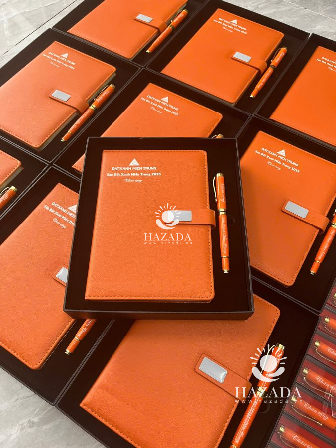 Set quà tặng sổ da + bút ký kim loại: Sang trọng, bền đẹp, thích hợp tặng khách VIP.
